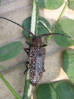 生活習(xí)性:西安一年發(fā)生2代,以老熟幼蟲(chóng)在果莢、枝條或樹(shù)皮縫中越冬。5月份出現(xiàn)成蟲(chóng),成蟲(chóng)晝伏夜出,將卵產(chǎn)在樹(shù)冠外圍表層新發(fā)小枝的復(fù)葉葉柄基部,近期初孵幼蟲(chóng)從羽狀復(fù)葉葉柄基部蛀入為害,受害處排出黑褐色糞沫和木屑狀物;有遷徙為害習(xí)性,受害樹(shù)羽狀復(fù)葉萎蔫下垂,常從葉柄基部脫落或枝條枯萎折斷,形成禿梢或樹(shù)冠禿頂,嚴(yán)重影響槐樹(shù)的生長(zhǎng)和觀(guān)賞效果。