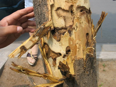 2、人工殺卵:每年7月至8月天牛產(chǎn)卵期,在樹(shù)干上查找卵塊,用鐵器擊破卵塊。