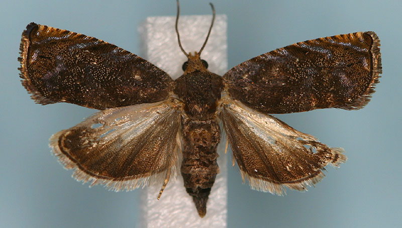 形態(tài)特征:成蟲(chóng)體長(zhǎng)5mm,黑褐色,胸部有籃紫色閃光鱗片,前翅黑褐色;卵扁橢圓形,初產(chǎn)乳白色,漸變黑褐色;幼蟲(chóng)圓柱形,長(zhǎng)9mm,黃色,有透明感,頭部深褐色。蛹黃褐色,長(zhǎng)約8mm,臀刺8根。